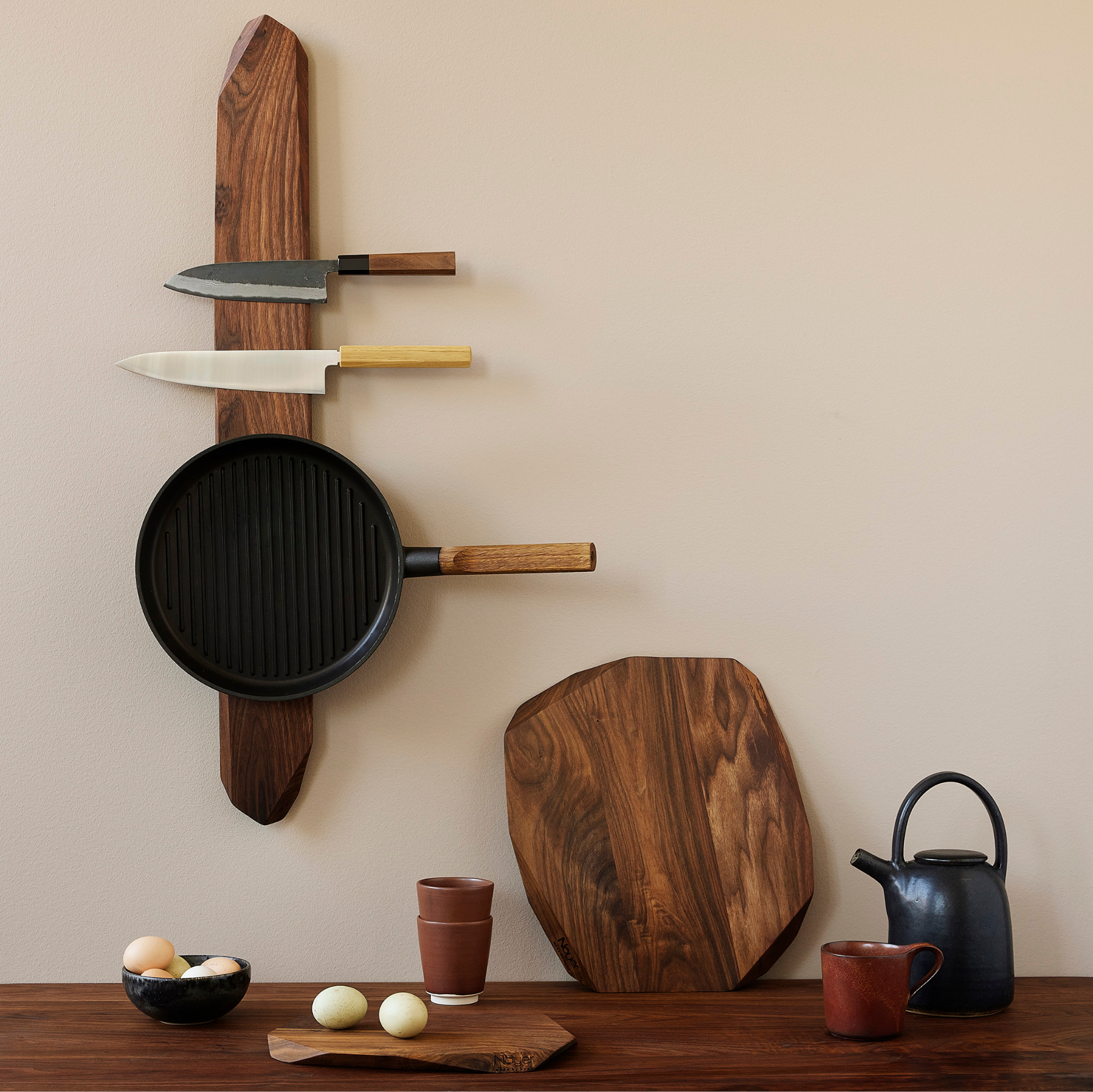 Dette skærebræt fra Noyer fremstilles med udgangspunkt i strukturen i det enkelte stykke træ, og derfor er der ikke to skærebrætter, som er ens. Skærebrættet har otte kanter, og brættets form bestemmes på baggrund af træets struktur.