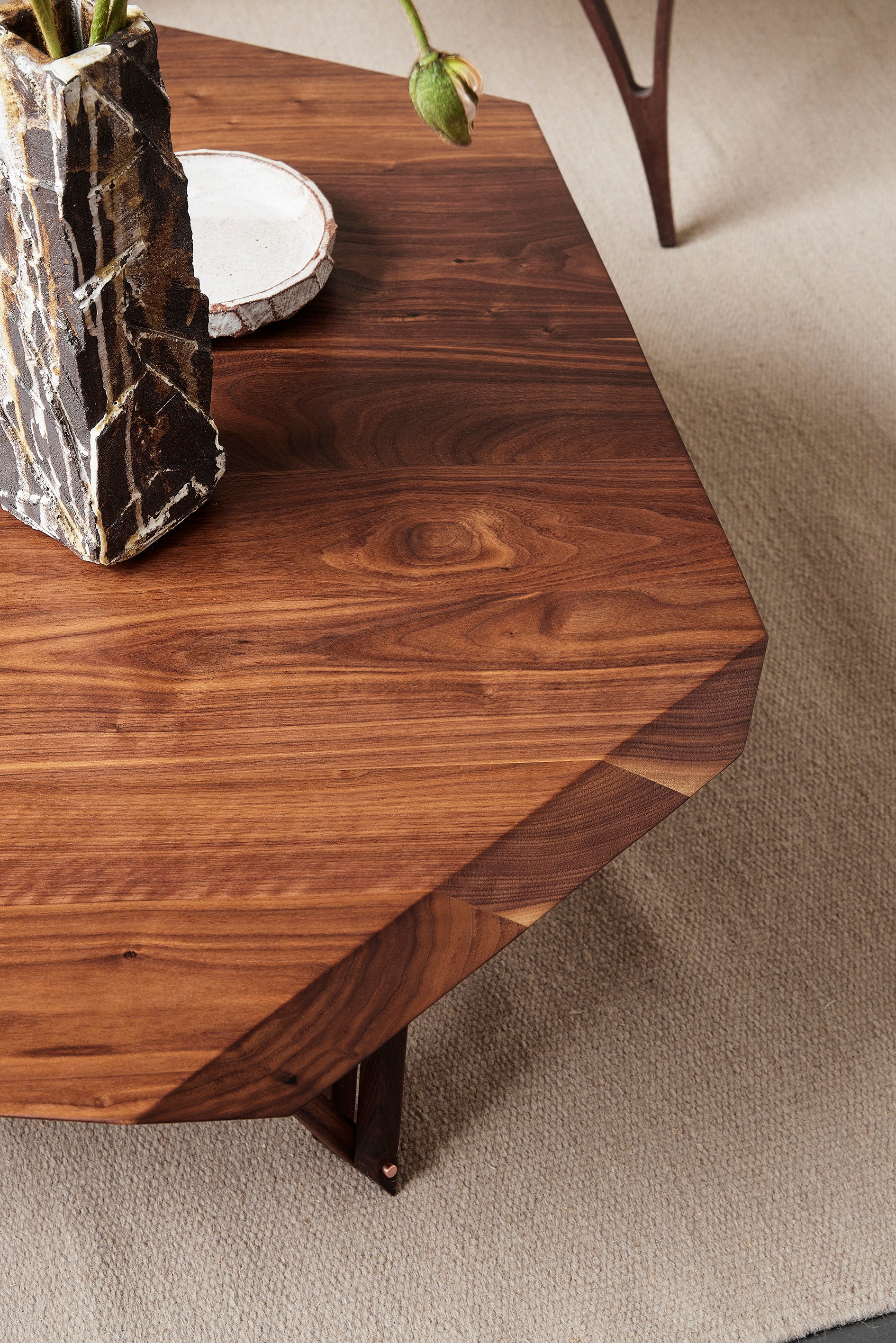 Valnød er en træsort med ekstremt meget liv og forskellighed i årernes tegninger og udseende. Ved udvælgelsen af plankerne til det enkelte bord bruger vi meget tid – og al vores faglighed- på at vurdere og matche de forskellige planker, så de tilsammen giver en harmonisk, levende og smuk ottekantet bordplade. De modsatrettede vinkler på bordets kanter giver træets markante åretegninger en ekstra dimension, da tværsnittet på de enkelte planker bliver synligt.